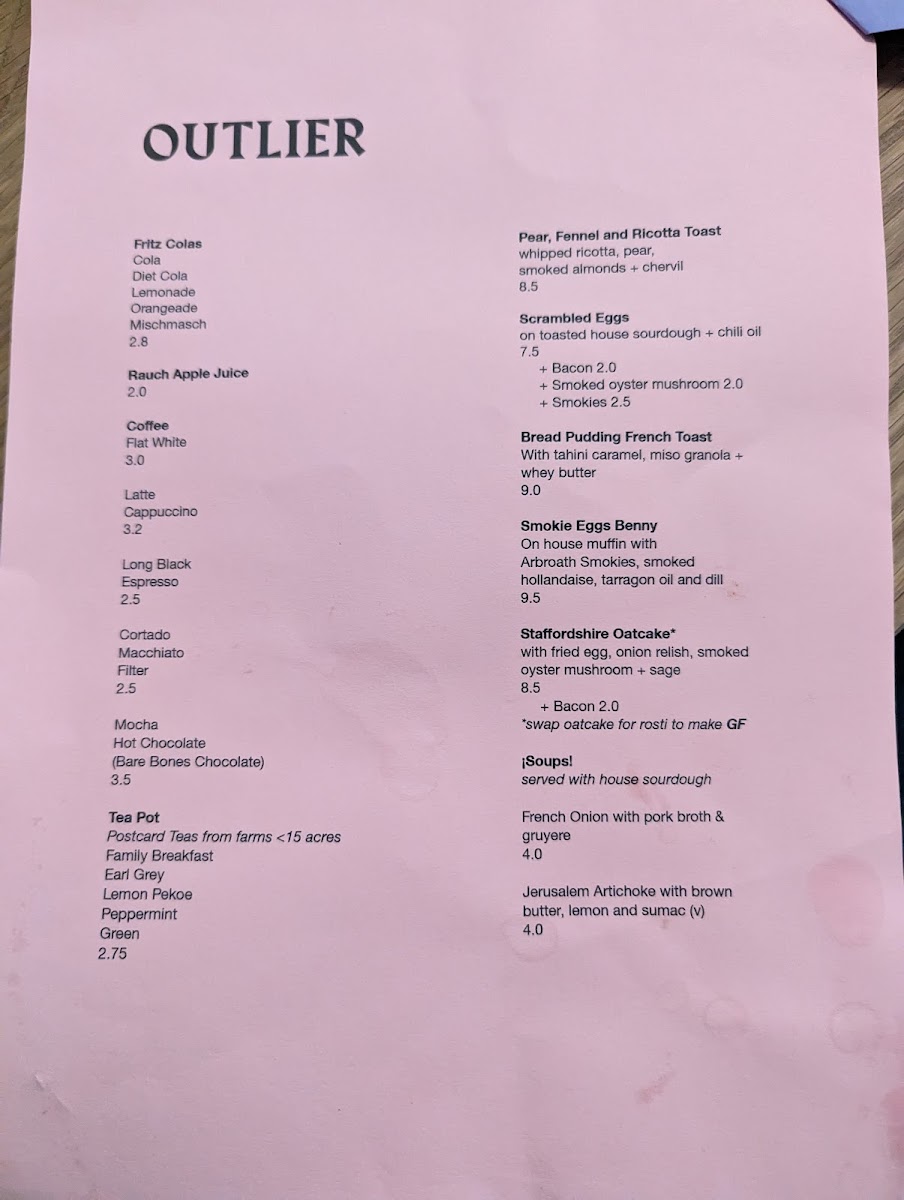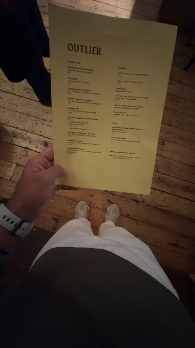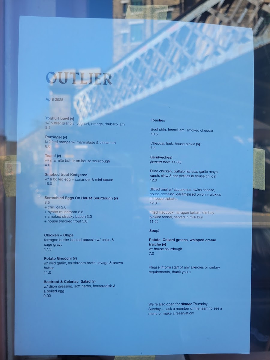 The feedback from customers like James Berry and Rob Brown highlights not just the remarkable food, but the vibrant atmosphere brimming with friendly faces. Out of curiosity, I had to try the Poached Pear Yogurt Bowl (£9.50) and Porridge (£9.00); both were delightful breakfast choices that demonstrated OUTLIER's attention to quality and detail.